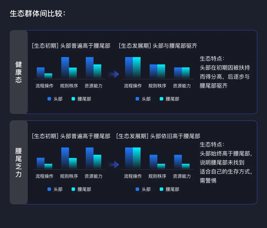 在不同发展阶段,平台生态建设的目标重点也不同。通过横向对比各指标差异,能够判断出现阶段短板问题,确定后续优化方向。